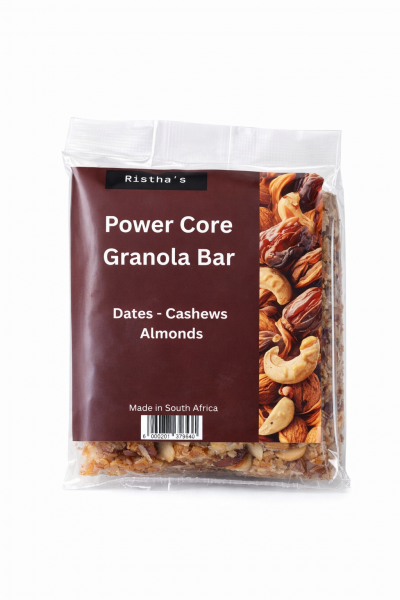 Enjoy Ristha’s Date, Cashew & Almond Granola Bar, made with dates, cashews, almonds, chia seeds, flax seeds, gluten-free rolled oats, and honey. A naturally sweet, nutrient-rich bar designed to fuel your body and keep you energized.