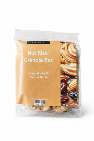 Boost your energy with Ristha’s Peanut Butter & Raisin Granola Bar, made with gluten-free rolled oats, peanut butter, almonds, raisins, chia seeds, honey, coconut oil, and vanilla. Perfect for a nutritious snack anytime.